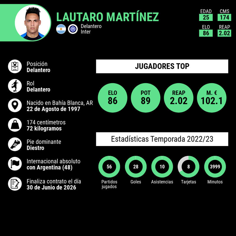 Al otro lado del campo tenemos a una revelación en todos los sentidos, pues nos encontramos a uno de los arietes titulares de la vigente campeona del mundo: Argentina. Y es que el jugador albiceleste Lautaro Martínez fue clave en algunos aspectos del campeonato entre naciones y tras esta competición llegó tan refortalecido que ha logrado conquistar, al igual que Erling, la copa nacional con el Inter de Milán.