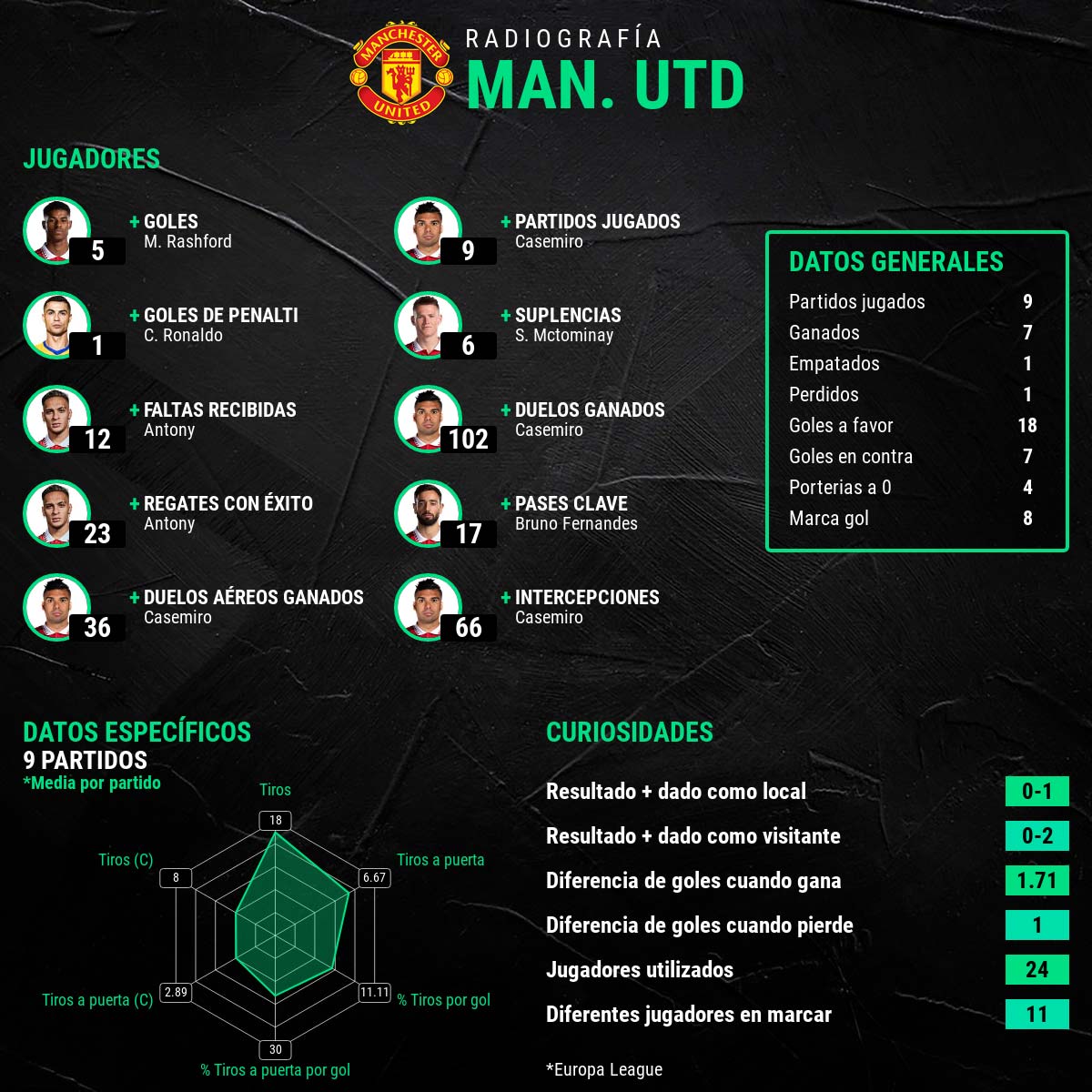 Por su parte, el Manchester United ocupa el 3º puesto de la Premier League con 50 puntos tras 26 partidos. En este tiempo, los ‘red devils’ han sumado 15 victorias, 5 empates y han sufrido 6 derrotas entre los que han marcado 41 goles y han encajado 35, lo que les deja un ‘average’ de +6. Entretanto, sus guarismos en Europa League son 7 encuentros ganados, 1 empatado y 1 perdido, el del debut con la Real Sociedad.
